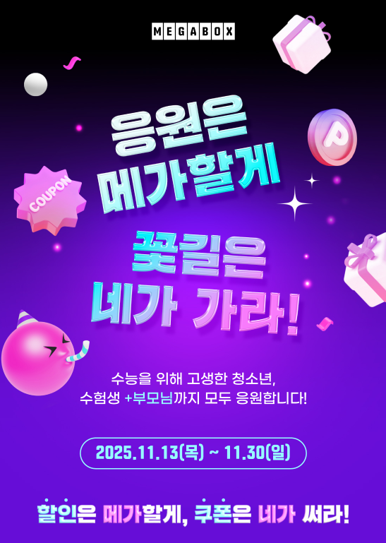 수능이 끝난 지금, 가장 먼저 누려야 할 혜택은 무엇일까요? 단순한 할인 그 이상, 메가박스가 수험생과 학부모를 위한 특별 이벤트를 마련했습니다. 🎉 지금 아니면 놓치는 이 기회, 영화 관람은 물론 다양한 선물까지 받을 수 있는 찬스! 끝까지 읽고 꼭 참여하세요!